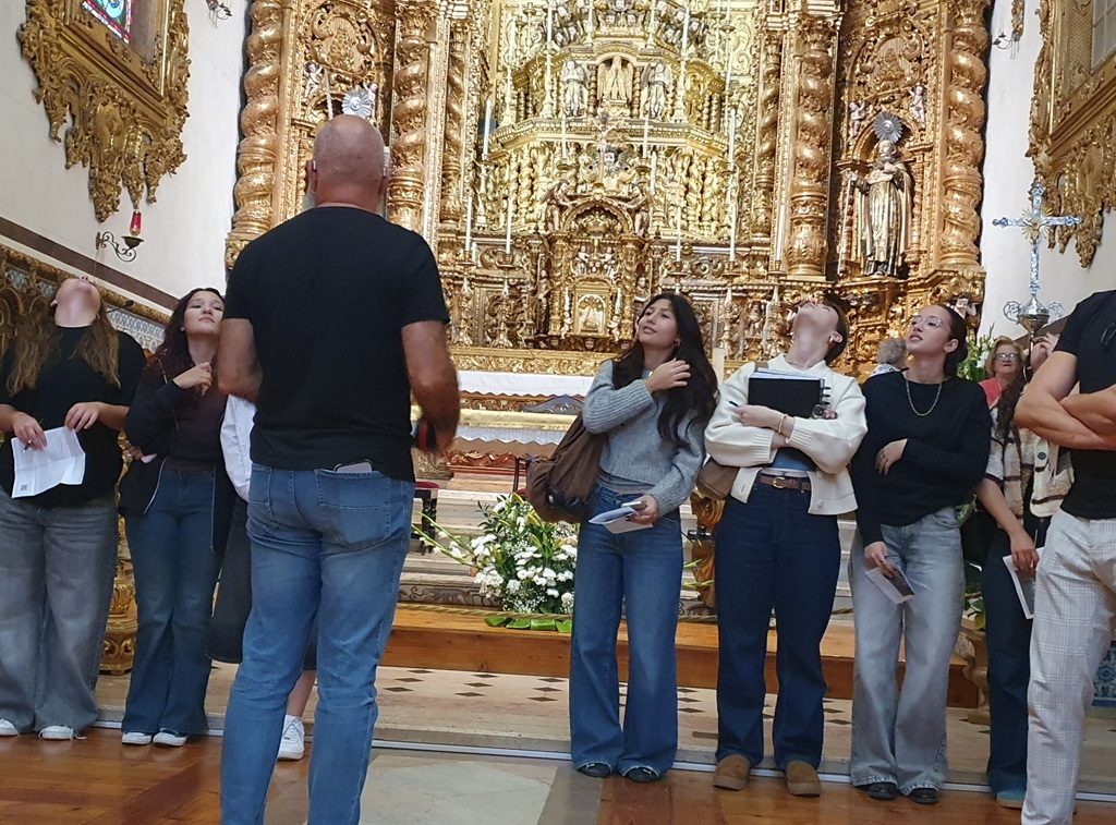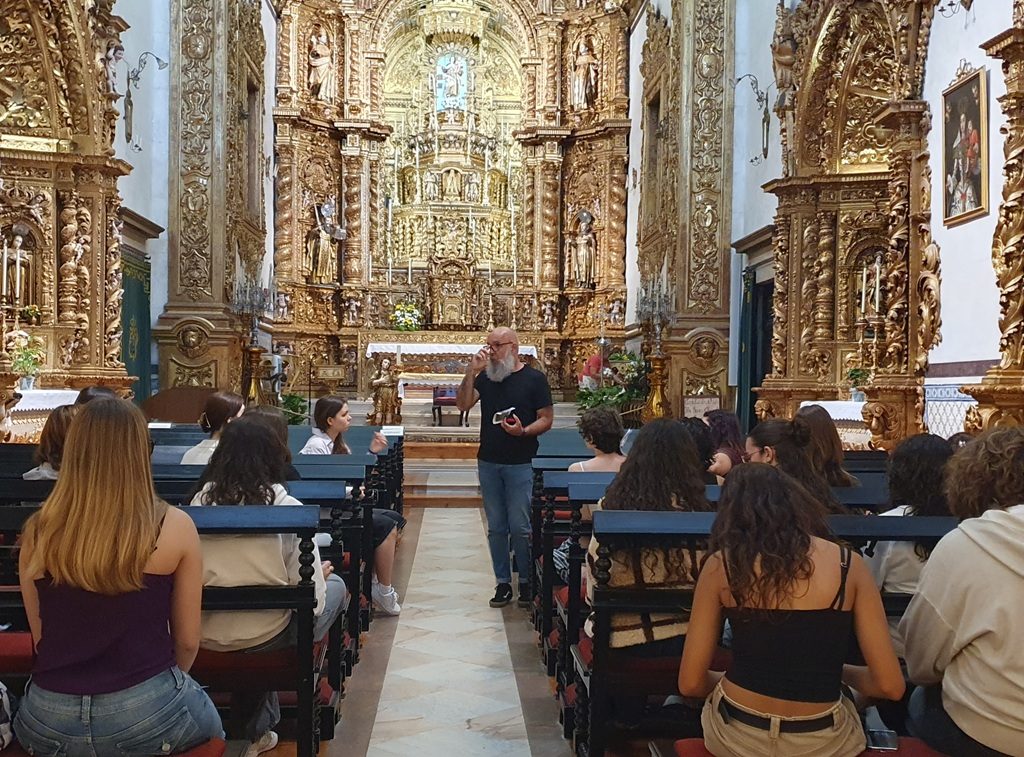 A visita foi orientada pelo Dr. Jorge Manhita, do Museu Municipal de Faro, que guiou os alunos numa análise detalhada deste notável exemplo da arte barroca em Portugal, abordando aspetos como a riqueza ornamental, o uso expressivo da luz e da cor, e a importância simbólica da talha dourada.