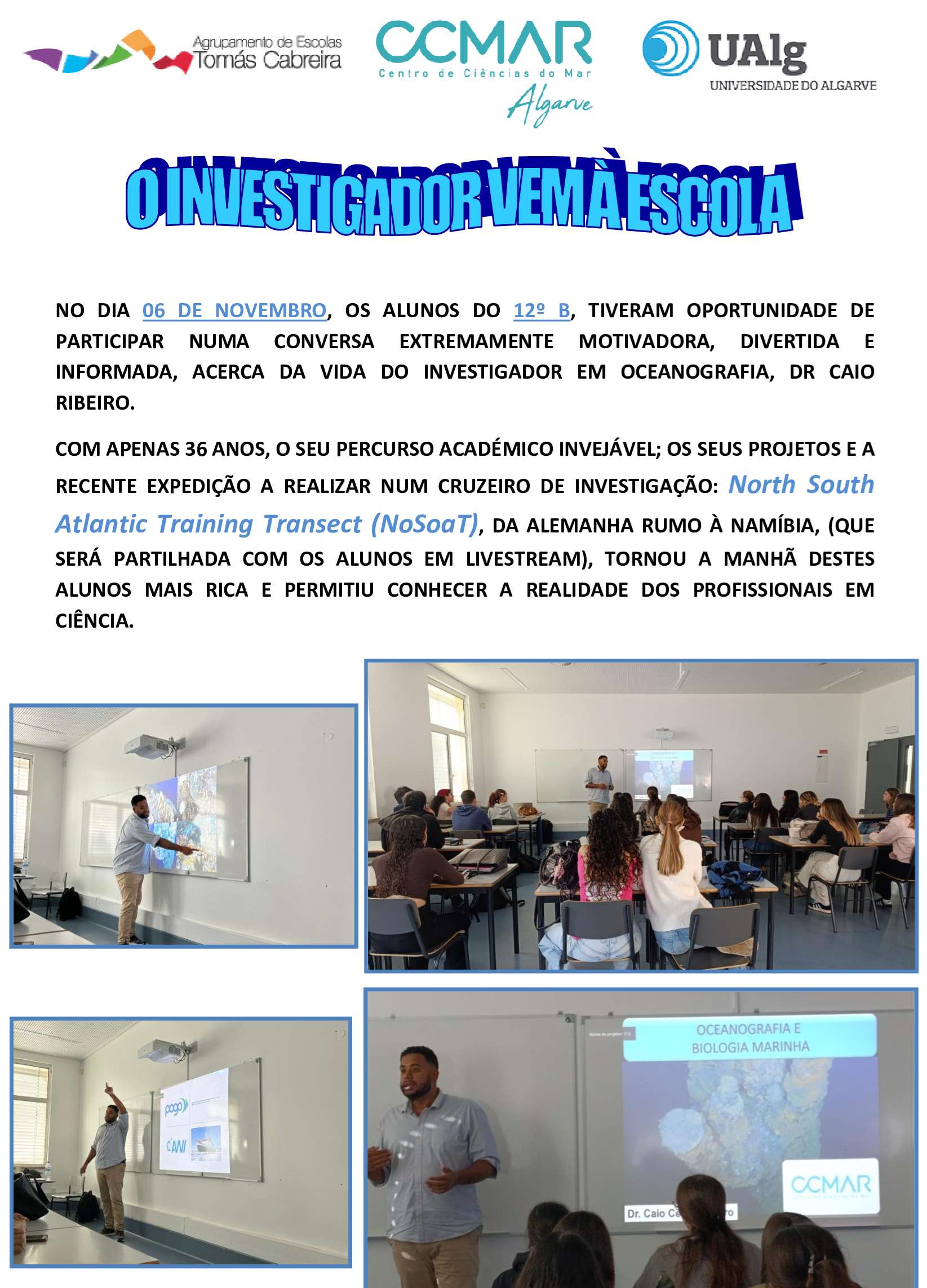 No dia 06 de novembro, os alunos do 12º B, tiveram oportunidade de participar numa conversa extremamente motivadora, divertida e informada, acerca da vida do investigador em oceanografia, Dr. Caio Ribeiro.
